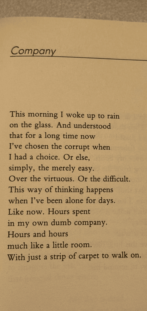 The last part: "In one room, / the going on and on of childhood. / In another, a swarm of pond sludge / moving toward your legs. I, who / once made an island of the dark, / draw close to this carnival of feathers."